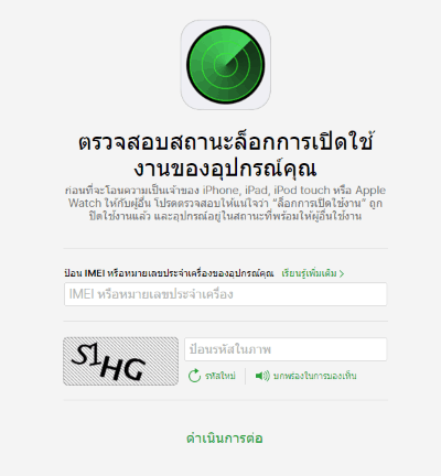 icloud.com/activationlock แล้วใส่หมายเลข IMEI เครื่องของเราแล้วกรอกรหัสที่เห็นในรูปด้วย แล้วคลิก Continue แล้วตรวจสอบผล